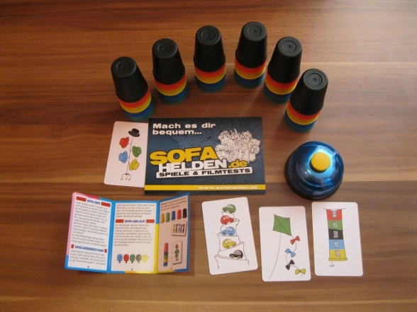 Die Verpackung von Speed Cups 6 bietet durch die mit Folie verkleideten Aussparungen schon einen ersten Blick auf das Spielmaterial. Im Inneren sind die dreißig Becher fest in einem Kunststoffeinsatz verstaut. Ein winziger Kritikpunkt ist dabei die Aufteilung in vier Fächer mit sechs Bechern und zwei mit dreien. Dadurch muss man bei jedem Spiel die Becher neu sortieren. Positiv zu erwähnen ist aber, dass alles seinen Platz hat. So auch die Klingel, die ebenfalls sehr fest im Zentrum des Kartons untergebracht ist und die Karten, die aber gerne mal einen Ausflug durch die Schachtel machen. Ansonsten macht das Spielmaterial aber einen sehr guten Eindruck. Die Becher wirken sehr robust und haben eine gute Größe. Über das Format der Karten kann man sich streiten, zumindest sind sie aber sehr nett gestaltet und bieten sowohl einfache als auch anspruchsvolle Motive. Zu Spielbeginn sucht sich jeder Spieler fünf verschiedenfarbige Becher heraus und positioniert sie vor sich. Die Karten werden gemischt und bereitgelegt und die Klingel für alle Spieler gut erreichbar in die Mitte des Tisches gestellt. Dann kann das Spiel beginnen.