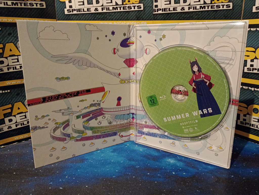 Plaion Pictures veröffentlicht die Blu-ray von Summer Wars als Digipack im O-Card Schuber. Der Schuber zeigt auf der Vorderseite die beiden zentralen Figuren Kenji Koiso und Natsuki Shinohara vor einem Schlüsselloch, das den Eintritt in die umliegende virtuelle Welt von "OZ" symbolisiert. Auf der Rückseite ist Kenjis Ersatz-Avatar zu sehen, der ihm zugeteilt wird nachdem er seinen eigenen Account verloren hat. Das Digipack präsentiert ein durchgehendes Szenenmotiv aus der Anfangsphase des Films, wogegen der Innendruck die "Startseite" von "OZ" zeigt. Zusätzlich beinhaltet das Digipack drei Artcards. Cover & Bilder © Plaion Pictures / Produktfotos: www.sofahelden.de Das Fazit von: MarS
