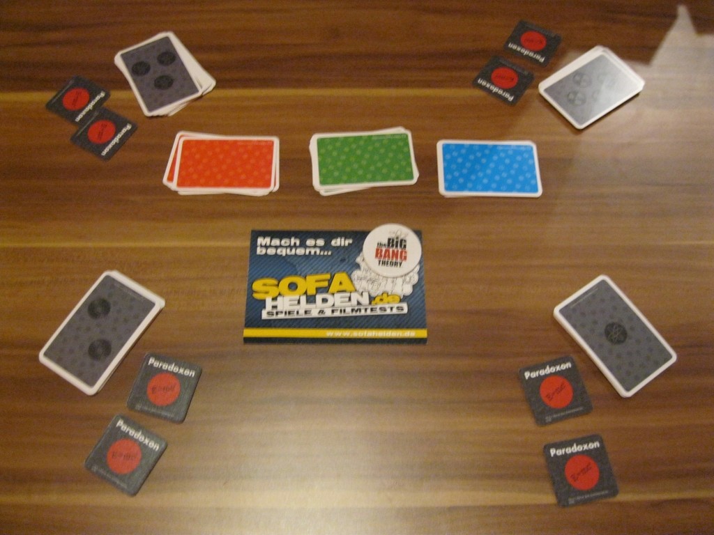 Anschließend kann man zur richtigen Spielvorbereitung übergehen. Es gibt vier Sets aus je fünfzehn Spielkarten, die anhand ihrer Rückseite unterschieden werden können. Jeder Mitspieler erhält ein solches Set und mischt es. Jeder Spieler legt die Kartenstapel verdeckt vor sich hin und zieht fünf Karten. Nun werden die Paradoxon-Plättchen gezogen und ebenfalls verdeckt vor den jeweiligen Spieler gelegt. Jeder Spieler darf seine eigenen Plättchen jederzeit anschauen. Die Anzahl der Paradoxon-Plättchen richtet sich nach der Zahl der Spieler. Bei zwei Spielern vier, bei dreien drei und bei vier Spielern zwei. Anschließend werden die „Haben Will“-Karten sortiert nach ihren Farben gemischt und in drei Stapeln verdeckt in die Mitte gelegt. Die Vorbereitung ist nun abgeschlossen und der Spieler, der das Katzentanzlied am schönsten singen kann, darf anfangen.