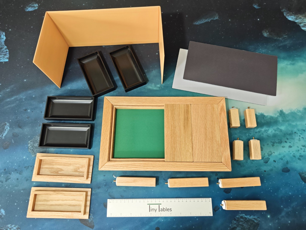 Der Tiny Table kommt in einer sehr stabilen Verpackung, die auch super zur Aufbewahrung oder zum Transport verwendet werden kann. Alle Komponenten haben gut gepolsterte Fächer. Alles sitzt fest, nichts wackelt. Öffnet man die Verpackung, findet man auf der obersten Ebene vier schwarze Plastik-Trays und ein Lineal. Diese Ebene lässt sich komplett herausnehmen. Darunter kommt dann der Tisch zum Vorschein, mit seinen vier Tischplatten. Außerdem gibt es einen Sichtschutz. Und drumherum befinden sich jeweils vier kurze und vier lange Tischbeine. Aufgebaut ist der Tisch in nur einer Minute. Tischbeine wählen, von unten via Schraubverbindung eindrehen, fertig.