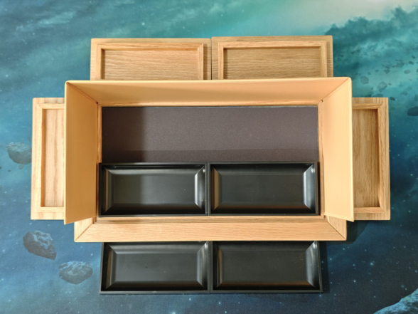 Die Verarbeitung des Tisches ist super, wir sind wirklich überrascht. Gerade in so einem kleinen Format Holz so passgenau zu bearbeiten, kann nicht einfach gewesen sein. Es handelt sich ja auch nicht um einen simplen Tisch. Vier herausnehmbare Tischplatten liegen passgenau auf einer inneren Leiste auf, die selbst auch eine Einkerbung hat. Der Tisch hat zudem auch außen eine Einkerbung zum Einhängen von Zubehör. Und tatsächlich lassen sich die vier Tischplatten umdrehen und dort einhängen, wo sie als Trays für z.B. Tokens oder Münzen fungieren können. Nun sind wir schon bei den Funktionen.