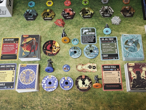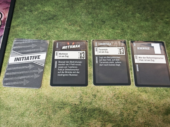 Zuletzt gibt es noch ein paar Vorbereitungen, die spezifisch für den gewählten Bösewicht sind. Der Spielplan mit Mothman enthält Brücken, die in Form von Brückenplättchen ausgelegt werden. 1 Unheilsplättchen kommt dann auf Brücke 1. Die Marsinvasoren haben Invasionswellen-Karten, von denen eine der Spieleranzahl entsprechende Menge ins Initiativekartendeck gemischt werden. Außerdem werden die 4 Invasionsplättchen gemischt und kommen verdeckt auf die vorgesehenen Felder des Spielplans.