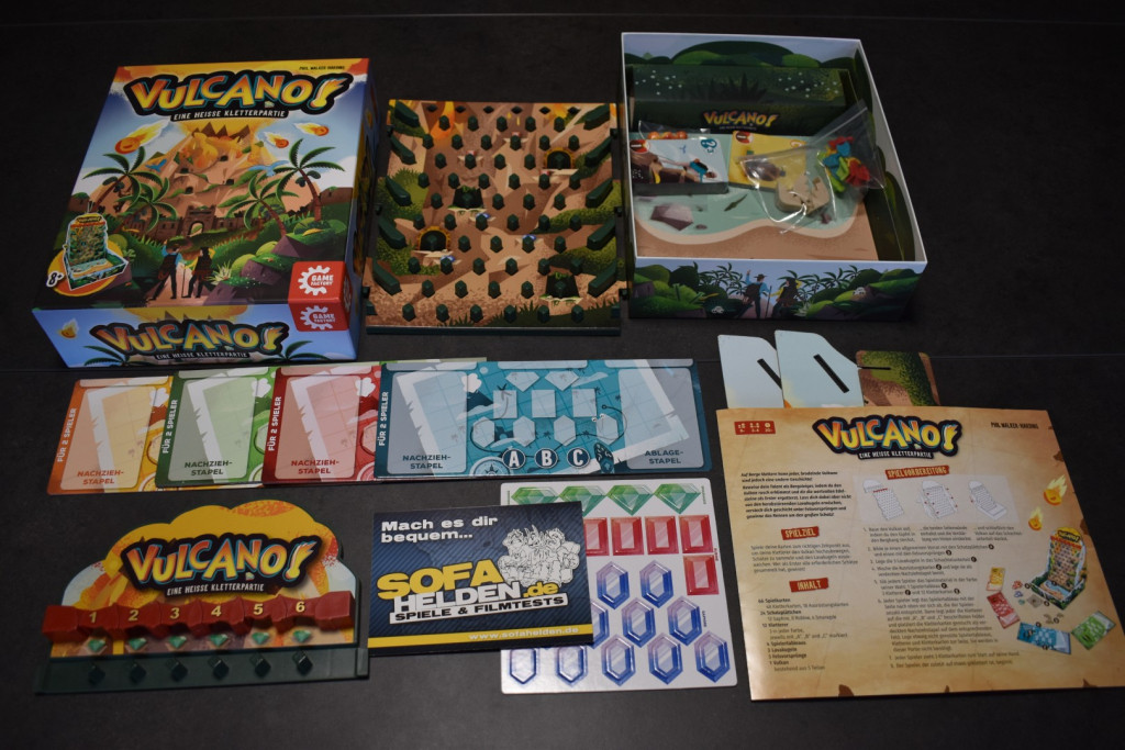 Bereits auf der Spielwarenmesse 2025 in Nürnberg sprach uns das Spiel mit seinem auffälligen Aufbau an. Der Vulkan wird aus zwei Kunststoffelementen zusammengesteckt. Beide sind mit Kartoneinlagen versehen, die den Berg grafisch dazu machen. Am Gipfel befinden sich sechs Einwürfe für die Lavakugeln. Außerdem ist der komplette Berg mit „Nubsis“ versehen, die zur Lenkung der Kugeln und als Abstellfläche für die Figuren dienen. Damit der Vulkan auch ordentlich steht, gibt es noch drei weitere Kartonelemente, mit deren Hilfe man das Ganze in der Schachtel aufbauen kann. Somit können dann auch die Lavakugeln nicht wegrollen. Hinzu kommen vier Spielerbögen, zwei eingeschweißte Kartenstapel sowie drei Zippbeutel mit Felsvorsprüngen, Figuren und den Lavakugeln. Zum Auspöppeln gibt es auch etwas, nämlich die Edelsteine, die Ihr im Spielverlauf sammeln sollt. Insgesamt macht das Spielmaterial einen sehr guten Eindruck und ist relativ robust. Dennoch sollte man gerade beim Aufbau mit den Kartonelementen aufpassen, da sich die einzelnen Schichten beim Stecken lösen können. Die Karten sind leider in Folie eingefasst und lassen sich sehr schwer auspacken. Entweder braucht man gute Fingernägel oder ein Messer.